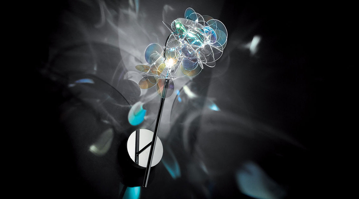 Animates space with elegance and spontaneity, awakening memories of a past full of celebrity divas and limelight with its shape and chromes. LED illuminated cylinders are arranged at different heights around a central ring and alternate shades of precious metals in pastel colours with transparencies. The brushing of the metallisation leaves to the light the task of creating the suggested decorum.